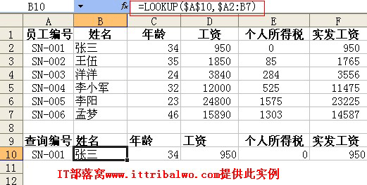 向量型的LOOKUP函数是指在单行区域或单列区域中查找值,然后返回第二个单行区域或单列区域中相同位置的值。 LOOKUP 函数具有两种语法形式:向量型和数组型。矢量形式的 LOOKUP 函数在一行或一列区域(称为向量)中查找值,然后返回另一行或一列区域中相同位置处的值。数组形式的 LOOKUP函数在数组的第一行或列中查找指定值,然后返回该数组的最后一行或列中相同位置处的值。 向量型的LOOKUP 函数的语法是:LOOKUP(lookup_value,lookup_vector,result_vector) 数组型的LOOKUP 函数的语法是:LOOKUP(lookup_value,array) 注意:为了方便显示,只列举了有限条数的记录,在实际工作中一个数据表肯定不可能只有那么几条记录。 实例:使用向量型的LOOKUP函数进行查询。详见下图。 操作步骤介绍: 第一, 首先建立查询列标识,并输入要查询的编号,如本例输入:SN-001。 第二,选中B10单元格,输入公式:=LOOKUP($A$10,$A$2:$A$7,B2:B7) 按下回车键,确定,即可得到员工编号为SN-001的姓名。 第三,选中B10单元格,向右复制公式,即可得到员工编号为SN-001的工资、所得税等信息。 第四,如果需要查询其他员工的信息,只需要在A10单元格中重新输入员工编号即可快速查询到该员工编号的相关信息。 本实例我们讲解Excel中数组型的LOOKUP函数实例。 实例:使用数组型的LOOKUP函数进行查询。详见下图。 注意:为了方便显示,只列举了有限条数的记录,在实际工作中一个数据表肯定不可能只有那么几条记录。 操作步骤介绍: 第一, 首先建立查询列标识,并输入要查询的编号,如本例输入:SN-001。 第二, 选中B10单元格,输入公式:=LOOKUP($A$10,$A2:B7) 按下回车键,确定,即可得到员工编号为SN-001的姓名。 第三,选中B10单元格,向右复制公式,即可得到员工编号为SN-001的年龄、工资、所得税等信息。 第四,如果需要查询其他员工的信息,只需要在A10单元格中重新输入员工编号即可快速查询到该员工编号的相关信息。 数组型的LOOKUP函数的语法是在数组的第一行或第一列中查找指定数值,然后返回最后一行或最后一列中相同位置处的数值。