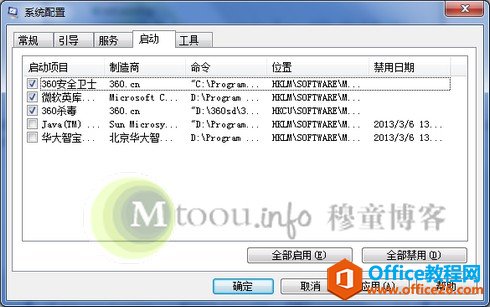 对于以下不用的服务项目,可以将其禁用,这样可以提供系统的启动速度,并腾出系统CPU、内存等资源。在需要的时候,则可以通过启动项命令再在这里将其启用即可。而对于一些软件的自动启动现象,我们可以通过“启动”选项卡进行调整。如下图所示: