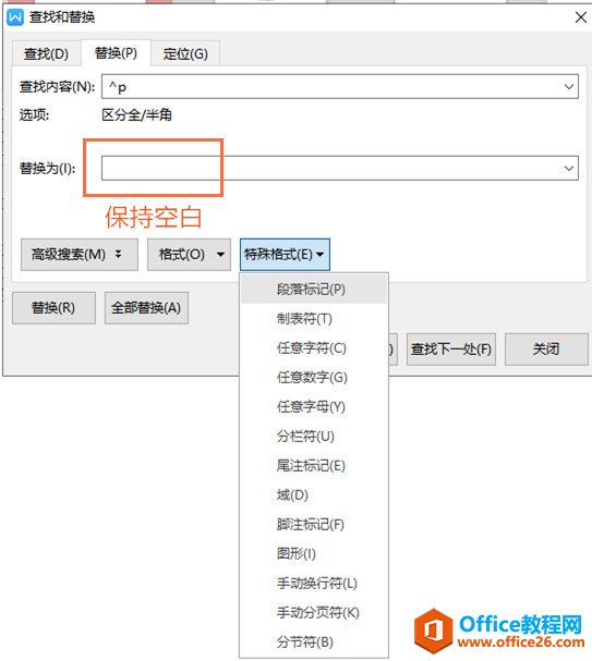 首先,按住“Ctrl+H”调出查找替换框,点击“查找内容”选择下方的“特殊格式”中的段落标记。