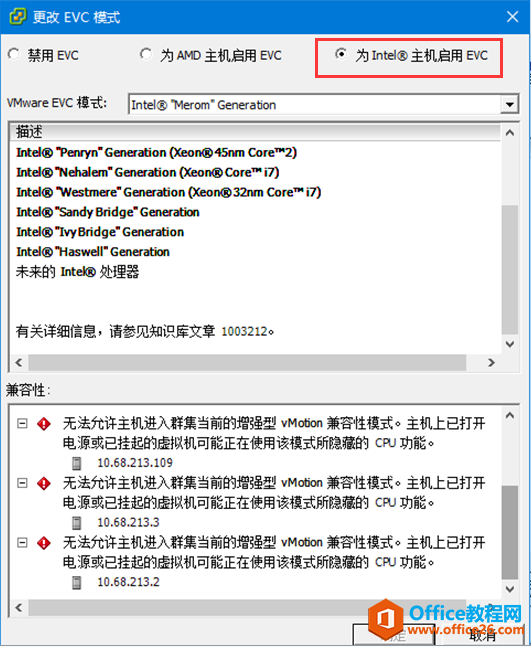 9、vMware EVC中,如果服务器都是Interl平台的,就选择为Intel主机启用。如果服务器都是AMD平台的CPU,就选择为AMD主机启用EVC。