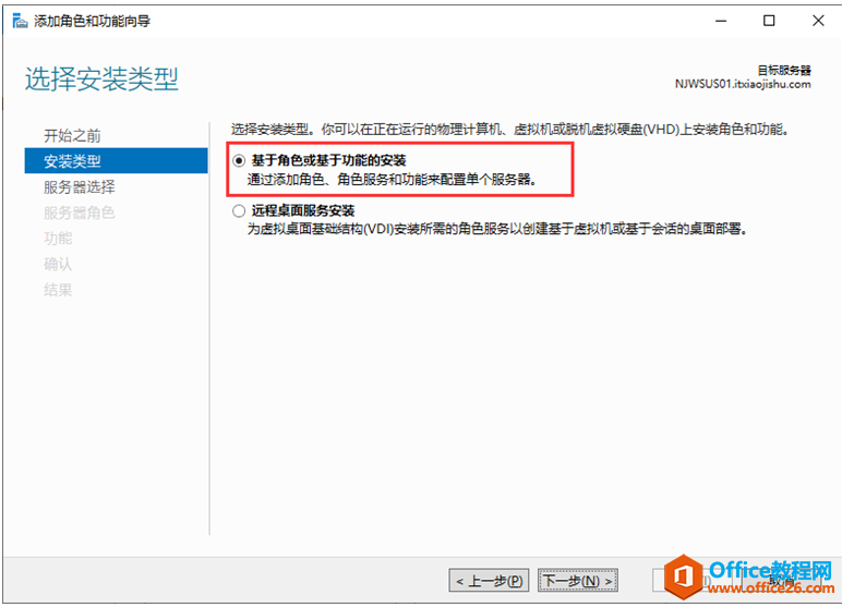4、在“选择目标服务器”中,选择服务器所在的位置(从服务器池或虚拟硬盘中)。选择位置后,选择你想安装 WSUS 服务器角色的服务器,然后单击“下一步”
