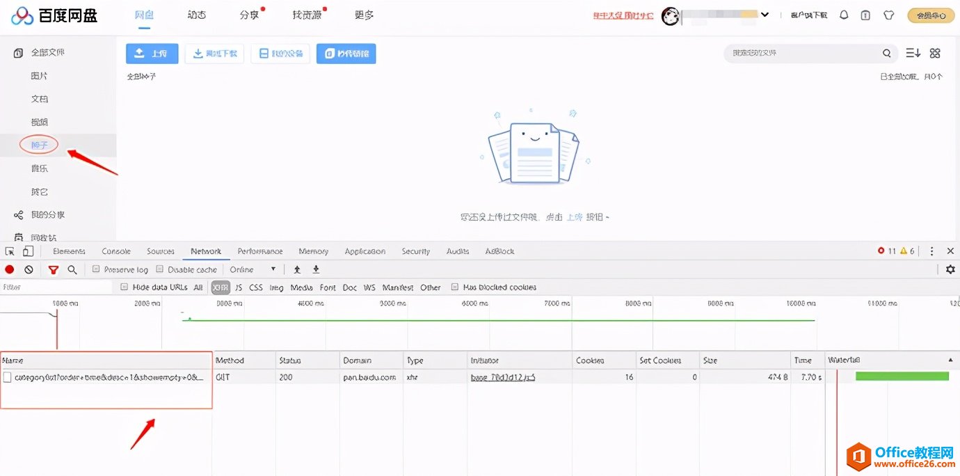使用Chrome浏览器访问百度网盘主页,完全载入后按F12调出控制台,选择网络(NetWork)选项卡,目前应该空空如也: