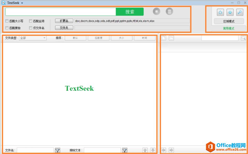 4、多种搜索选项。 结果可按文档类型、文件名、文件内容过滤,可按文件大小、修改时间和匹配度排序,还支持匹配大小写、匹配整词和匹配原词。