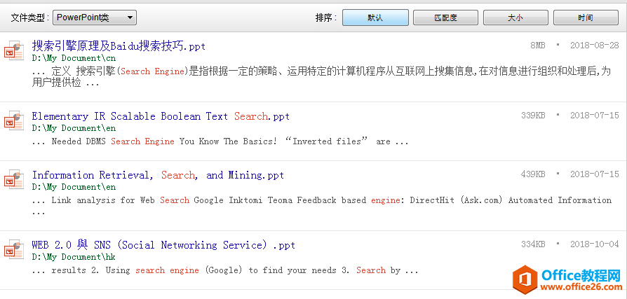 接下来,让我们试试对搜索结果的操作吧。结果区的左上角可以按文档类型过滤,我选PPT类,如下: