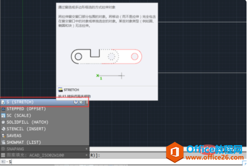2、完成绘制后,启动拉伸命令,直接输入“ S”,系统会弹出一系列命令快捷方式,直接按空格键选择第一个“ STRETCH”拉伸命令;