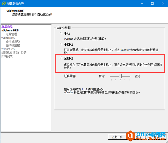4、选择“手动,半自动,还是全自动”。根据自己的需要求去选择。一般服务器集群都是选择手动,有服务器插了加密狗的,就不能要虚拟机自动迁移。