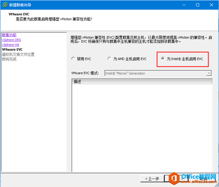 9、vMware EVC中,如果服务器都是Interl平台的,就选择为Intel主机启用。如果服务器都是AMD平台的CPU,就选择为AMD主机启用EVC。