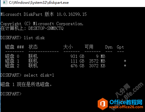 2、输入【list disk】命令可以查看电脑上的硬盘列表及序列号(后面带*号的是GPT硬盘)。