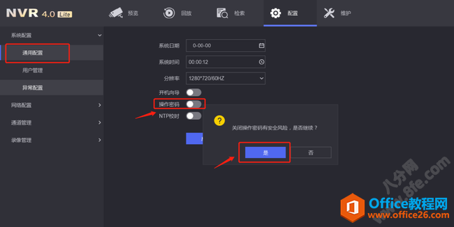 配置-系统配置-通用配置-基本配置,取消操作密码,点击是。