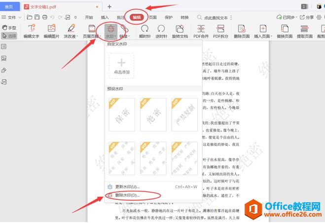 第二步,点击菜单栏的【编辑】-【水印】-【删除水印】: