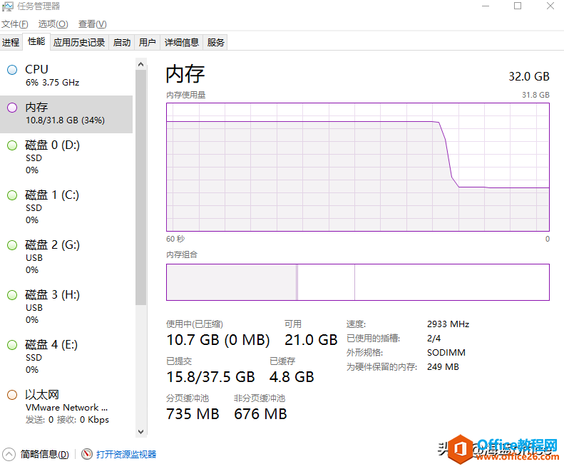 目前,小编的打开的程序占用了10个G左右的内存,占用总内存使用的30%左右,系统及软件运行流畅;