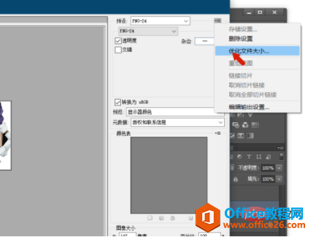 4、设置完成后点击另存为web所用格式,在打开的窗口中选择优化文件大小。