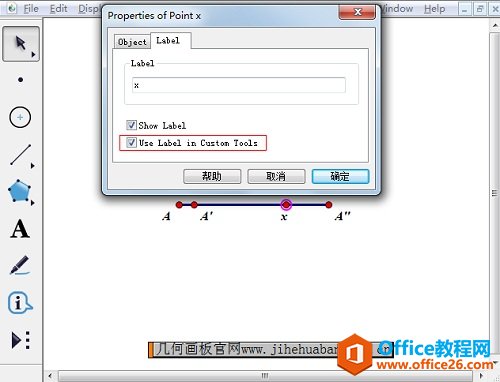 步骤三 选中线段AA’’,然后选择“构造”——“线段上的点”命令,得到线段上的点x。选中点x,然后选择“编辑”——“属性”命令,在弹出的属性对话框中勾选“在自定义工具中使用标签”。