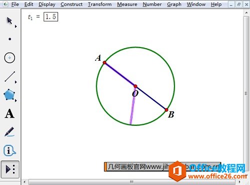步骤三 在左侧工具箱选择“自定义工具”——角工具——n等分角工具,按照A\O\B的顺序点击三个点:A、O、B,然后点击左上角的参数,此时,半个圆被分成了1.5等分。如下图所示。