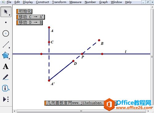 步骤一 画一直线,在工作区中任意画两个点A、B。双击直线,作为标记镜面,选中点A,“变换”——“反射”作出过点A作直线l的对称点A’,构造线段A’B与直线l的交点即为所求的点P。