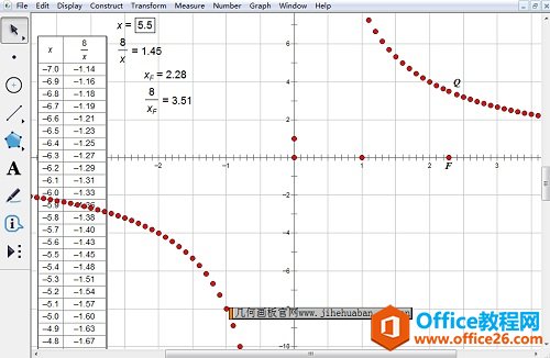 步骤三 假设我们演示的是在[-6,8]区间的双曲线图像。在曲线[-6,8]上取一点F,“度量”——“横坐标”,得到xF=2.28,“数据”——“计算”计算出8/xF=3.51,选中(2.28,3.51)绘制点Q。