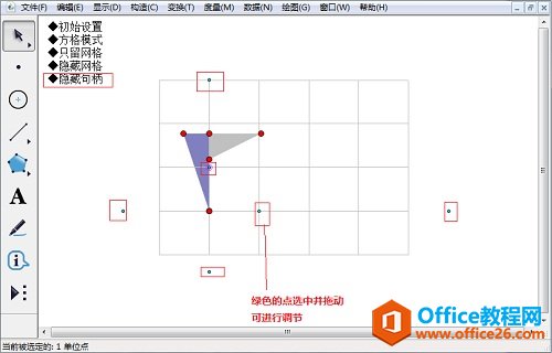 4.使用点工具,在网格上构造点,就能够精确地绘制在格点上了(下图中的三角形是选中三个点后构造三角形内部形成的)。