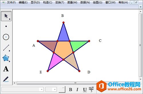 用几何绘图工具绘图时,有时我们需要给图形的不同部份填充不同的颜色加以区分或者显示。以五角星为例,如何利用几何画板给五角星填色呢?