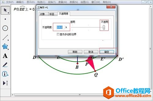 4.构造三角形C’D’E’和弧EE’上的点P。构造△C’D’E’,在弧EE’上构造一个点P,选择菜单“度量”——“点的值”。