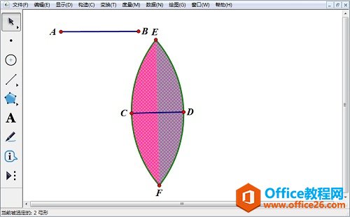 5.构造弧内部绘制出凸透镜。选中两个弧,选择“构造”—“弧内部”—“弓形内部”命令。凸透镜绘制完成,如下图所示。