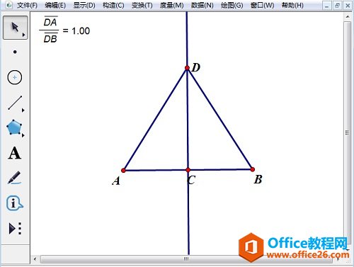 5.也可以同时选中线段AD、线段BD,然后选择“度量”—“比”命令,得到如下图所示结果。