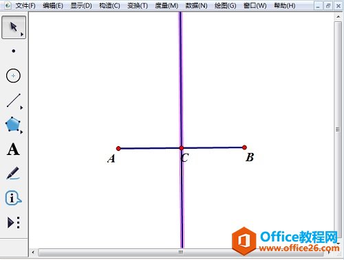 2.选中线段AB和点C,选择“构造”—“垂线”命令,绘制出线段AB的中垂线。如下图所示。
