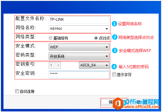 在弹出的对话框中,自定义设置配置文件名,设置 网络名称,网络类型选择 点对点,安全模式选择WEP(Ad-Hoc网络仅支持WEP加密),在安全密钥中输入密码,如下图所示:
