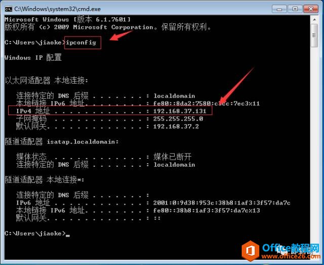 在里面找到以太网适配器 本地连接中的IPv4地址,192.168.37.131地址就是本机的IP地址了。