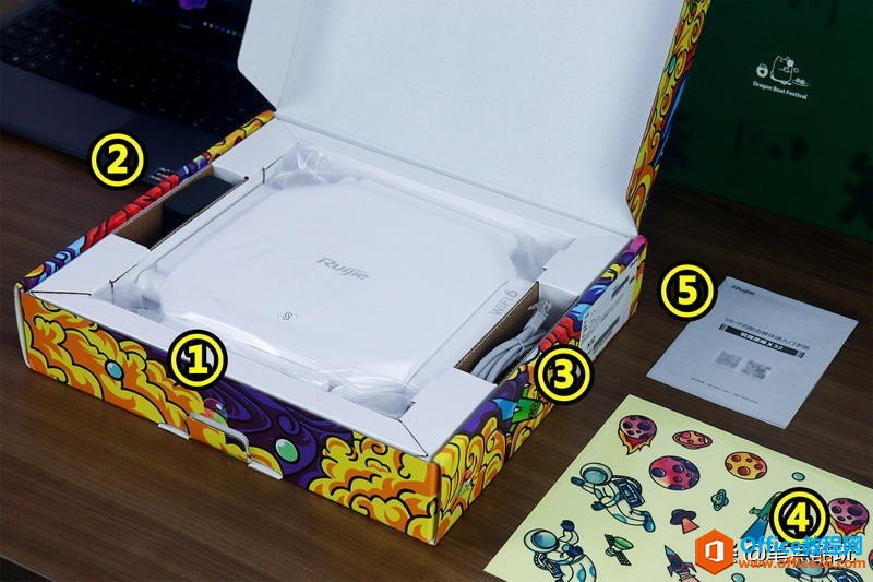 先做个简单开箱。锐捷星耀X32拿出一个礼盒范儿的包装盒,而且这斑斓色彩让人看过后倍感年轻。下图可见主机①外,还有②电源适配器、③千兆网线、⑤说明书以及一张航天元素跑满的贴纸,不喜欢单调色彩的朋友,可以把锐捷星耀X32装点得更漂亮。