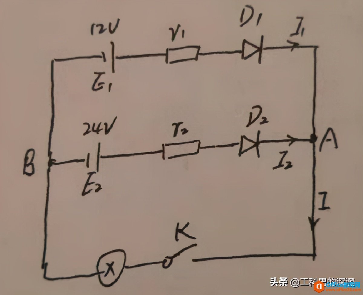 当两个不相等的电源并联,需要在电源正极串联上一个二极管进行电路保护。如上图,那么若连通开关,灯泡两端电压是多少呢?