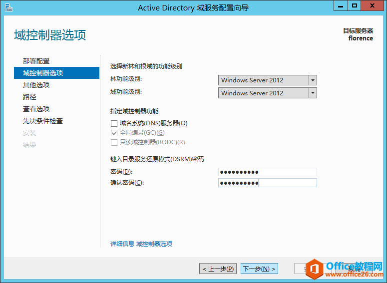 去掉“DNS服务器”的勾选项,输入还原模式密码(此密码在本系列后续中的‘恢复域控制器’会用到),