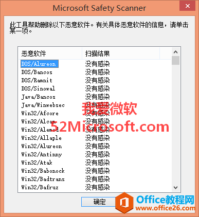 等待扫描完毕,就会显示扫描结果。很幸运,Microsoft酋长的电脑目前没有恶意软件列表中列出的恶意软件,所以显示“没有检测到恶意软件”。如图: