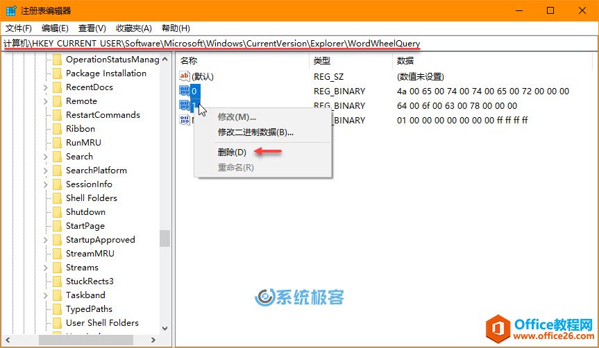 计算机\HKEY_CURRENT_USER\Software\Microsoft\Windows\CurrentVersion\Explorer\WordWheelQuery