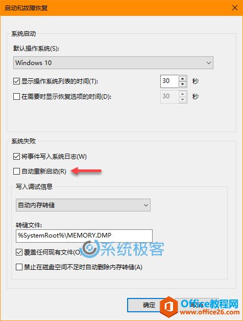 2在「启动和故障恢复」中点击「设置」按钮——取消勾选「自动重新启动」——点击「确定」按钮后就可以了。