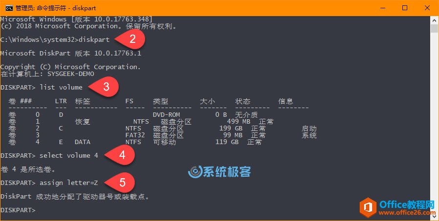 4以下命令以选择要分配新盘符的卷(驱动器):