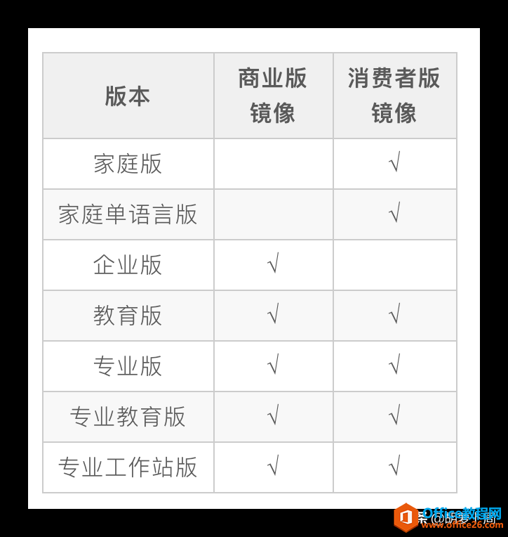 微软主要提供了两个镜像,即商业版和消费者版镜像。那么,商业版镜像和消费者版镜像的区别在哪呢?请看下表: