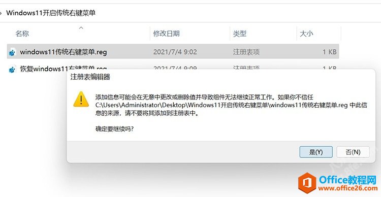 2、双击“windows11传统右键菜单”合并到注册表,然后重启电脑即可生效。