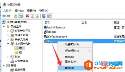 从打开的“计算机管理”界面中,依次展开“计算机管理”-“本地用户和组”-“用户”项,此时就可以在右侧找到“Guest”账户,右击“Guest”账户选择“属性”项。