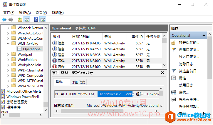 在“事件查看器”左侧的导航窗格中定位至“应用程序和服务日志 - Microsoft - Windows - WMI-Activity”,查看其中的事件日志。如图:
