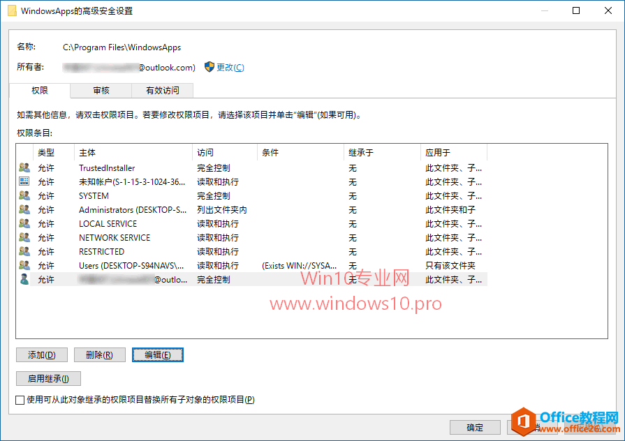 首先参照《Win10管理员帐户获取访问文件夹的权限》一文的操作步骤把WindowsApps文件夹的所有者更改为当前用户。