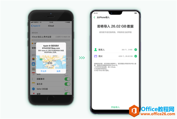 苹果手机上的iCloud账号登陆请求弹窗,选择“允许”。然后在OPPO新手机上填写iCloud的验证码,即可连接成功。点击OPPO新手机上的“开始导入”,即可对苹果手机的“联系人”和“照片”进行数据搬家。