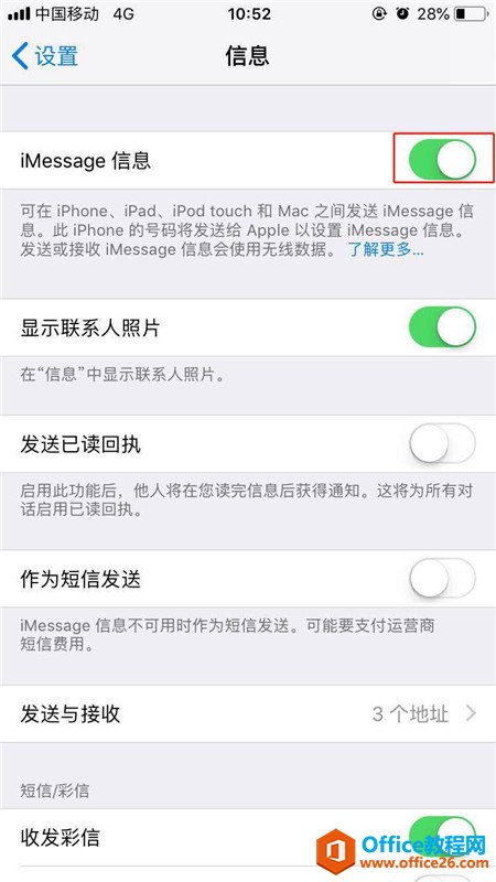 3、第一栏就是【imessage】,我们点击右侧的按钮,关闭即可;
