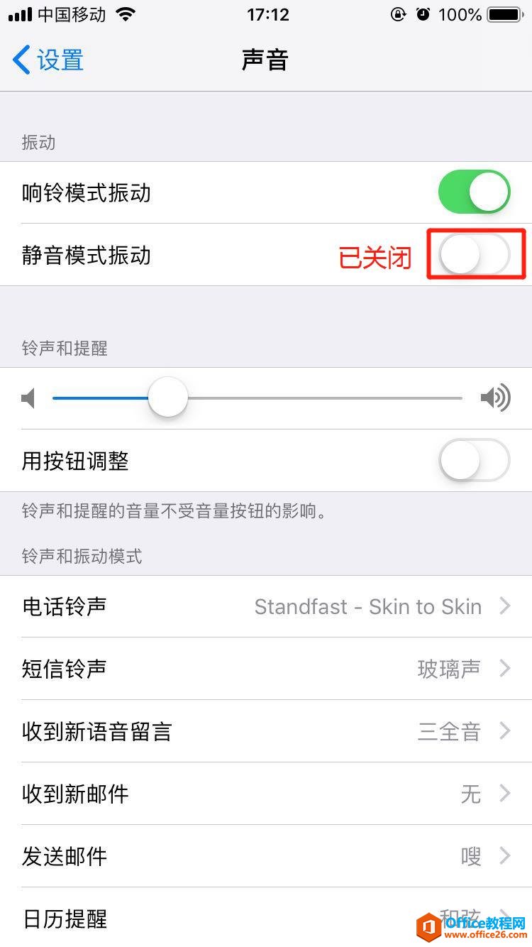 点击【静音模式振动】右边的按钮关闭即可,灰色为关闭。