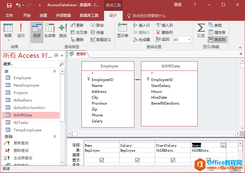 现在可以查看查询结果的所有员工信息,在查询网格中选择了某些字段; 与此同时,MS Access也创建了一个SQL查询,查询网格获得的结果。
