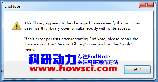 今天关闭EndNote,出现了如下错误:This library appears to be damaged. Please verify that no other user has this library open simultaneously with write access. If this error persists after restarting EndNote, please repair the library using the 「Recover Library」command on the 「Tools」 menu.这是怎么回事,如何解决。