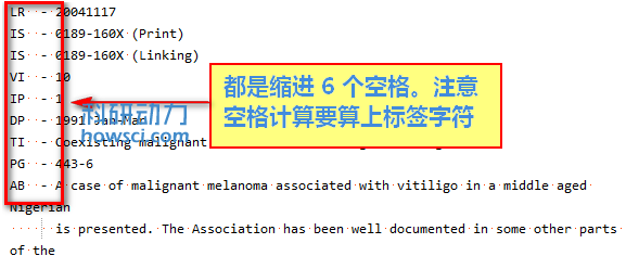 • Continuation lines must be indented:这一项指相同字段的内容须有相同的缩进,否则认为就不是相同字段的内容。其中「Smart Indent Identification」是把缩进的任务交给 EndNote 去干吧,自己头疼;「Indented」是 EndNote 干的不漂亮的时候,只能自己选择缩进了。比如 PubMed 的数据文件经常缩进 6 个空格,此时就可以在;「Indented」中输入数字「6」。查缩进多少可以把数据内容复制到 Word 中,并在 Word 中选择显示空格就可看到缩进多少个了。