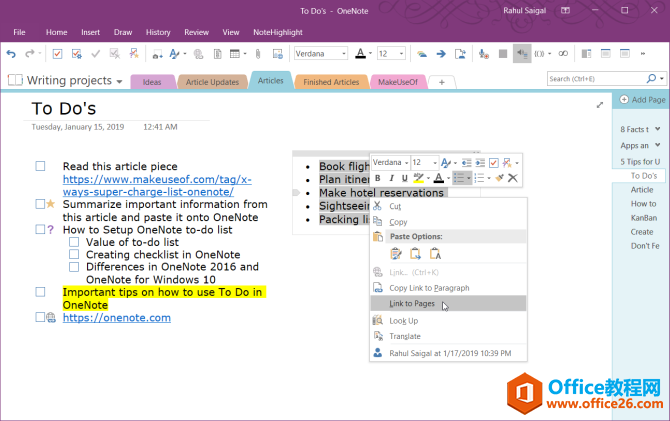 OneNote 2016提供了一项有用的功能,可让您立即将项目列表转换为单独的页面。每个任务都分配到笔记本中的单独页面。创建任务列表,右键单击并从上下文菜单中选择“ 链接到页面 ”。
