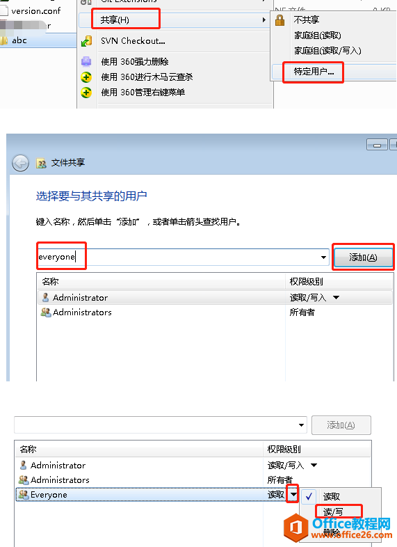 1.2、右键共享,添加用户everyone 权限设置为可读写