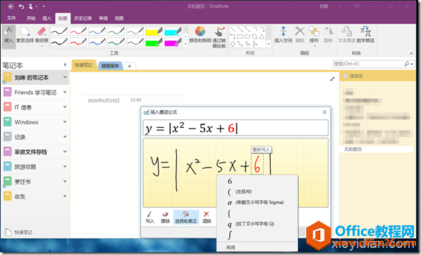 OneNote 对数字墨水技术提供了很好的支持,除了用触控方式在笔记中标注内容外,还提供了将手写数学公式转换为文本的功能。这个功能在触控设备上更好用,不过也支持鼠标「手绘」。