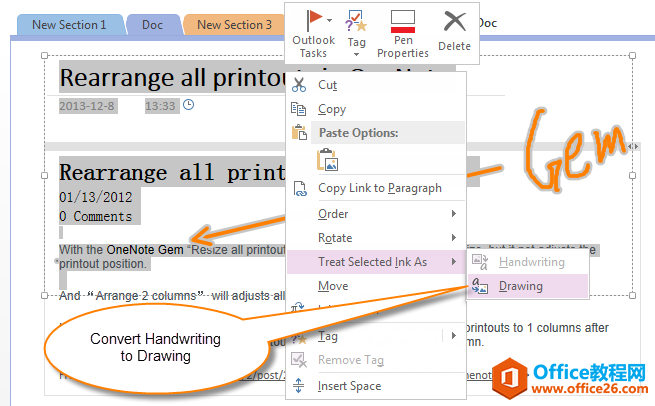 假设有一篇文章带有手写内容。我们想把箭头和手写“Gem”锁定到 "With the OneNote Gem …." 段落上。